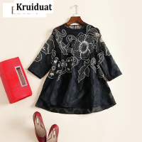 Kruidvat2017夏季钉珠立领A字摆七分袖重工绣花衬衣B075