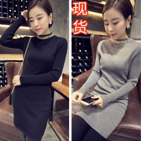 秋冬新款韩版中长款针织打底衫钉珠领修身套头连衣裙黑色均码