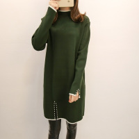 2017秋冬装新款中长款半高领打底衫钉珠开叉连衣裙宽松套头毛衣女军绿均码
