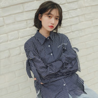 衬衫女韩范2017秋季新款宽松长袖镂空小清新竖条纹开衫女装上衣潮