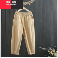 YIBUSHENG特大码九分裤女七分裤卡其色中年妈妈胖mm弹力薄款松紧腰休闲裤