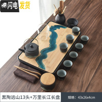 三维工匠 长江树脂茶盘创意密胺干泡托盘家用陶瓷功夫茶具小茶台 远山13头套组+长江-大长方-密胺黑