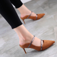 潮款拼色尖头细跟两穿单鞋女鞋2017秋季新款绒面浅口高跟鞋罗马鞋