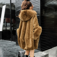 2017新款羊毛羊剪绒大衣女中长款狐狸毛领连帽皮草外套宽松斗篷款