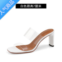 SUNTEK白色透明凉鞋女2023年新款夏季方头一字带高跟鞋粗跟仙女风气质