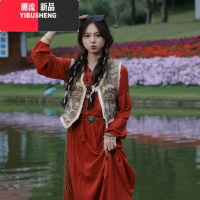 YIBUSHENG波西米亚度假长裙仙女民族风复古连衣裙重工刺绣长袖大摆红裙子