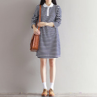 2017春季新款森女文艺大码海魂衫条纹彼得潘领大码宽松长袖连衣裙