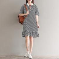 2017夏季新款森女文艺复古条纹彼得潘领大码宽松短袖荷叶边连衣裙