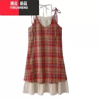 YIBUSHENG原创自制森系复古刺绣蕾丝拼接系带假两件吊带裙女连衣裙格子长裙