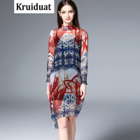 Kruidvat欧美2017春季新款女装时尚灯笼袖真丝连衣裙古兽印花两件套装裙FP红色