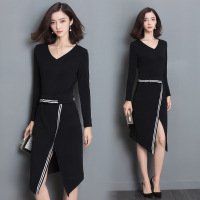 薇侣2017新品新款针织条纹连衣裙V领修身显瘦假两件套装裙