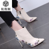 欧美细跟短靴女绣花拼色高跟鞋2017秋冬新款及踝靴尖头拉链马丁靴
