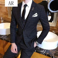 AR绅士英伦韩版修身格子西装三件套西服套装男商务正装新郎宴会礼服