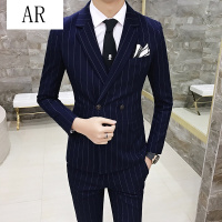 AR英伦风男士西服套装商务西装男条纹双排扣三件套韩版修身西装男