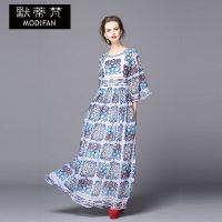 默蒂梵秋季新品走秀款复古蝴蝶印花大摆长裙礼服连衣裙图片色
