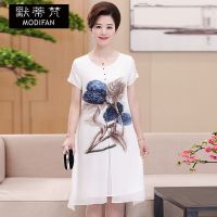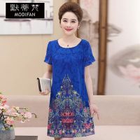 默蒂梵夏季新品中年女装宽松大码连衣裙妈妈装圆领短袖桑蚕丝中长裙