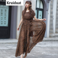 Kruidvat2017夏装新款豹纹雪纺连衣裙大摆拖地长裙褐色