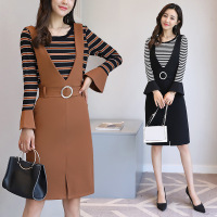莞馨2017女秋装新款条纹背带裙两件套连衣裙气质修身显瘦小香风套装裙