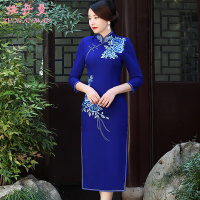 佐丹曼2017秋冬装优雅羊毛呢旗袍连衣裙中长款复古改良旗袍长袖旗袍裙蓝色