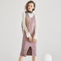 奥芝国 简约款 45羊毛三色绞花吊带V领前开叉中长款针织连衣裙女