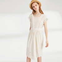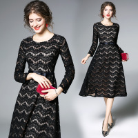 工厂出清 精品推荐 复古黑白真丝双绉镂空刺绣蕾丝中长款连衣裙