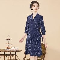 奥芝国跨年 真丝双绉 藏青小狗印花围裹式七分袖高腰中长款连衣裙
