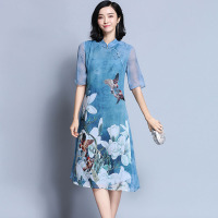 春夏女装新款重磅仿真丝印花连衣裙 中长款桑蚕丝改良旗袍
