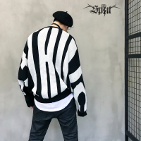 国潮宽松嘻哈套头蝙蝠袖毛衣男条纹撞色街舞运动BF情侣服针织衫秋