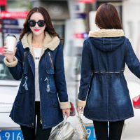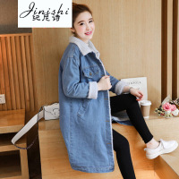 中长款牛仔外套女2017冬季新款韩版女装休闲羊羔毛加厚风衣深蓝色