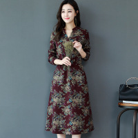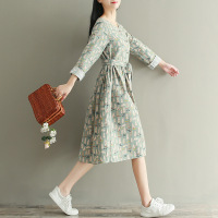 2017秋装新款中式复古盘扣连衣裙女长袖文艺卡通碎花系带中长裙子