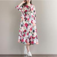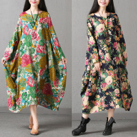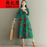 莞馨2017春季新款民族风大码女装长袖连衣裙复古文艺印花棉麻裙子