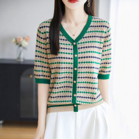 新法式V领条纹短袖针织开衫女夏季新款气质减龄遮肉显瘦百搭上衣