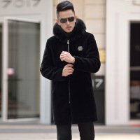 冬季海宁真皮皮衣皮草男皮毛一体中长款连帽狐狸毛领韩版修身外套黑色