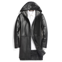 2017秋冬季海宁新款绵羊皮连帽真皮皮衣男中长款单皮风衣韩版外套黑色
