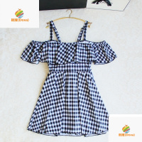 日系黑白色格子露肩连体泳衣女裙式遮肚显瘦保守学生游泳装泡温泉