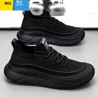 聚范纯黑色男鞋夏季透气飞织网面运动跑步防滑男士厚底增高百搭袜子鞋