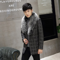 秋冬男装韩版毛修身大毛领千鸟格中长款呢子大衣青少年毛呢风衣