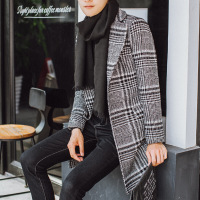 秋冬装韩版修身中长款千鸟格毛呢风衣大衣时尚男装男士外套