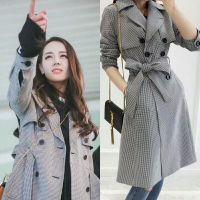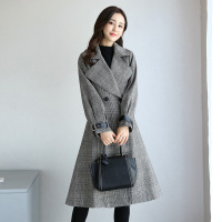 2017冬装新款欧美格子修身连衣裙摆风衣中长款大翻领格纹外套女图片色