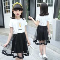 女童连衣裙2018夏装新款拼接纱裙甜美圆领黑纱中大童裙子韩版