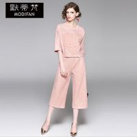 默蒂梵2017春夏新款欧美时尚炒色钉珠T恤+七分裤套装