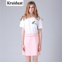 Kruidvat2017夏季新款欧美女装短袖小鹿钉珠T恤短裙两件套女B092白+粉