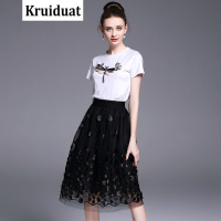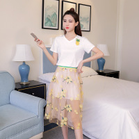 Kruidvat2017夏季新款欧美女装刺绣钉珠T恤+立体花朵蓬蓬网纱两件套连衣裙LSN白