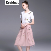 Kruidvat2017夏季新款钉珠绣花T恤+钉珠绣花网纱压折套装连衣裙LSN粉色
