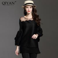 2017秋季新款女装拼接纱网露肩钉珠褶皱灯笼袖T恤宽松显瘦九分袖上衣黑色均码