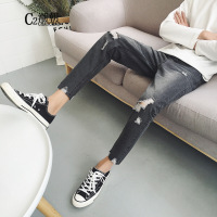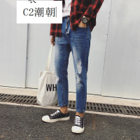 C2潮朝快手红人高迪天佑秋冬大破洞牛仔裤九分裤港仔文艺男百搭款蓝色