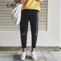C2潮朝权志龙同款韩版夏季男士修身九分裤子国潮火焰破洞牛仔裤青少年学生裤子黑色