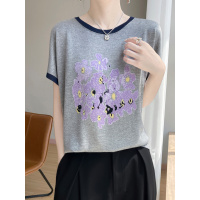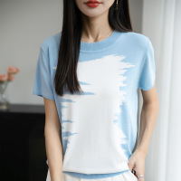 天丝莱赛尔圆领针织衫短袖T恤女25年夏季新款印花撞色打底衫上衣