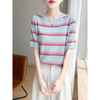 25年夏季新款冰丝圆领针织衫短袖T恤女撞色条纹设计感打底衫上衣