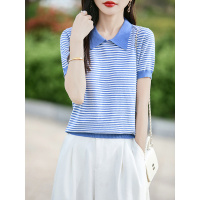 25夏季新款天丝娃娃领条纹短袖女百搭针织衫上衣打底休闲显瘦打底